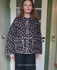 Adriane Jacket features a beautiful, casual silhouette. The jacket is lightly padded and quilt-stitched. It has a small collar, front pockets, and wooden buttons along the front placket. All edges are finished with cotton bindings. The jacket is made in a beautiful mix of printed leftover cotton fabrics.