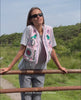 Caia Vest is a cute, short feminine vest made in leftover velvet cotton. It features two front pockets, a lining in leftover striped cotton, and edges finished with binding in the main fabric. The vest is decorated with an eye-catching explosion of colourful artwork consisting of flowers, birds, and poetic motifs made with Suzani embroidery.