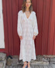Delphine Dress has a feminine silhouette with an empire cut just below the chest. It is made in a beautiful leftover schiffli cotton and features wide sleeves gathered at the openings with a small cuff. The dress has a deep V-neckline and is beautifully decorated with lace tapes placed along the cutlines and edges. An embroidered ‘Sissel’ signature is placed at the bottom hem as a delicate final touch.