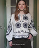 Erica Top is made from an organic cotton linen blend. It features a soft O-neckline and two tie bands at the front. The top has a cutline at the waist with a small ruffle and is closed from the second tie band down to the waistband. It is decorated with large flower embroideries with sheer centers. The top has balloon sleeves with gathers and elastic sleeve openings, detailed with embroidery and cotton lace tape. The hemline is finished with cotton lace trim.