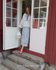 Falka Top has a loose, feminine fit with a gathered cutline at the waist. It is made in 100% organic cotton and features wide balloon sleeves gathered at the cuffs. The neckline is shaped as an O-neckline with a slim stand collar and a slit at the center front, finished with a set of tie-strings. The top is decorated with cute cross-stitch inspired embroideries placed in various places all over, and a small embroidered ‘Sissel’ signature at the front bottom hem.