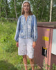 Juliane Top is a feminine, loose-fitted blouse made from leftover cotton in yarn-dyed stripes. It features a V-neckline with a slim collar and a front placket with button closure. The waistline is shaped with cut-and-insert detailing at both front and back, creating soft gathers for a flattering silhouette. The voluminous balloon sleeves are gathered and finished with elastic inside the sleeve openings. The top is decorated with zig-zag tape and delicate floral embroidery in a solid color, placed beautifully along the front and sleeves.
