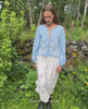 Maggan Top is a short, feminine top with a loose fit, crafted from organic cotton. It features wide, voluminous sleeves gathered at the shoulder, with elastic at the sleeve openings for a comfortable finish. The neckline is softly shaped and detailed with two sets of tie-strings at the front for closure. The top adorned with a poetic embroidery artwork, delicately decorated with beads.