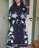 Rose Coat is made from 100% organic cotton canvas and lined with striped cotton. It features a classic collar, bone-look buttons, and a belt with fixed belt loops at the waist. The coat has classic sleeves and is decorated all over with Suzani embroidery featuring flowers, hearts, and horses.