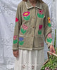 Twiggy Jacket is made in leftover corduroy cotton and features a casual silhouette with a small shirt collar and long sleeves. The front placket closes with buttons, and two pockets are placed at the lower front. The jacket is beautifully decorated with appliquéd tulip flowers crafted from a mix of leftover yarn-dyed checks and solid-colored cotton fabric and adorned with zig-zag tape in a contrasting color.