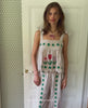 Wenke Top is a loose, relaxed top made of leftover cotton in yarn dyed stripes. It features a double-layer panel and elastic smock at the back for a comfortable fit. The lower part has gathered details at the top seam, which create the shape. The wide, adjustable straps tie at the shoulders. The top is decorated with intricate floral and clover motifs, crafted from a mix of embroidery and beadwork, and embroidered scallop edges.